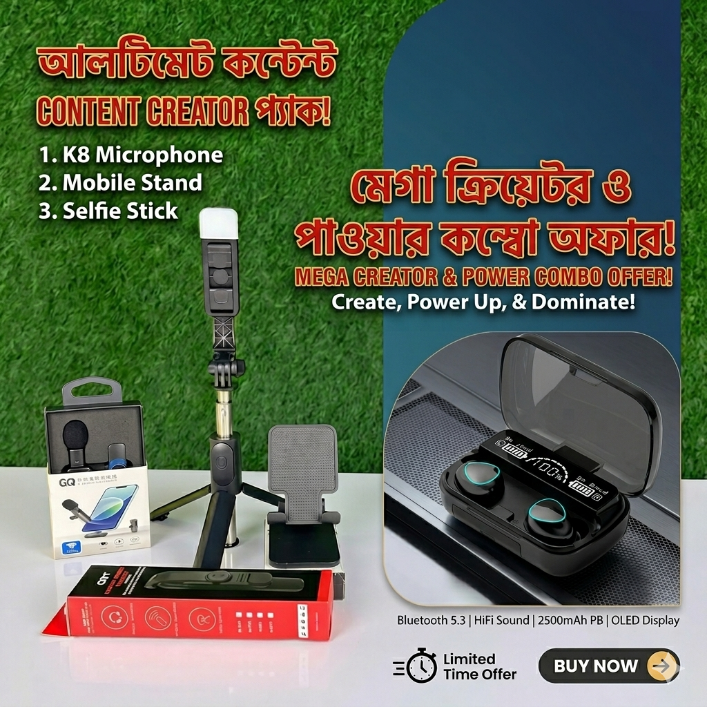 আপনার কনটেন্ট ক্রিয়েশন ও দৈনন্দিন স্মার্ট লাইফকে এক ধাপে এগিয়ে নিতে নিয়ে আসা হয়েছে Content Creator Combo + M10 TWS Earbuds (2500mAh Charging Box)—একটি পাওয়ারফুল ও স্টাইলিশ কম্বো, যা একসাথে কাজ, পড়াশোনা এবং এন্টারটেইনমেন্টকে করবে আরও সহজ ও প্রফেশনাল!